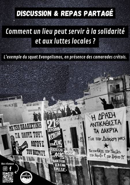 Les camarades crétois-es nous parleront de leur squat et son rôle dans le développement des luttes sociales, nous informeront de la situation en Grèce et en particulier en Crète... ça sera pour nous l'occasion de échanger autour de la nécessité locale (à Montpellier et aux alentours ) d'ouvrir des lieux de solidarité de classe et de lutte pour faire face aux politiques antisociales, à la fascisation et la répression.
